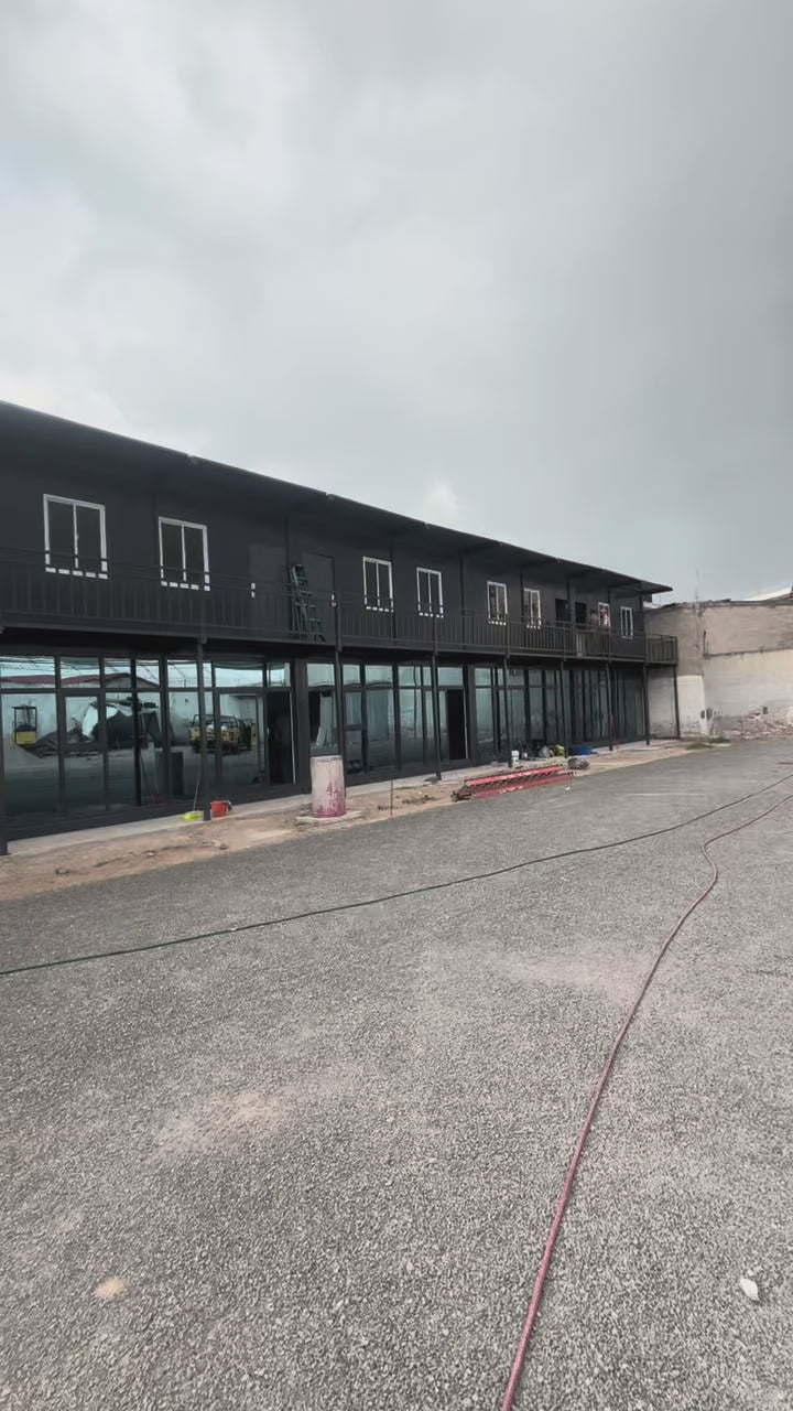 Edificio modular de 12 módulos de 6 x 4 x 3 m, en color negro y cancelería panorámica de vidrio templado con filtro solar, inversión de $2,227,000 MXN + IVA. Fabricación, traslado y ejecución en 5 meses.